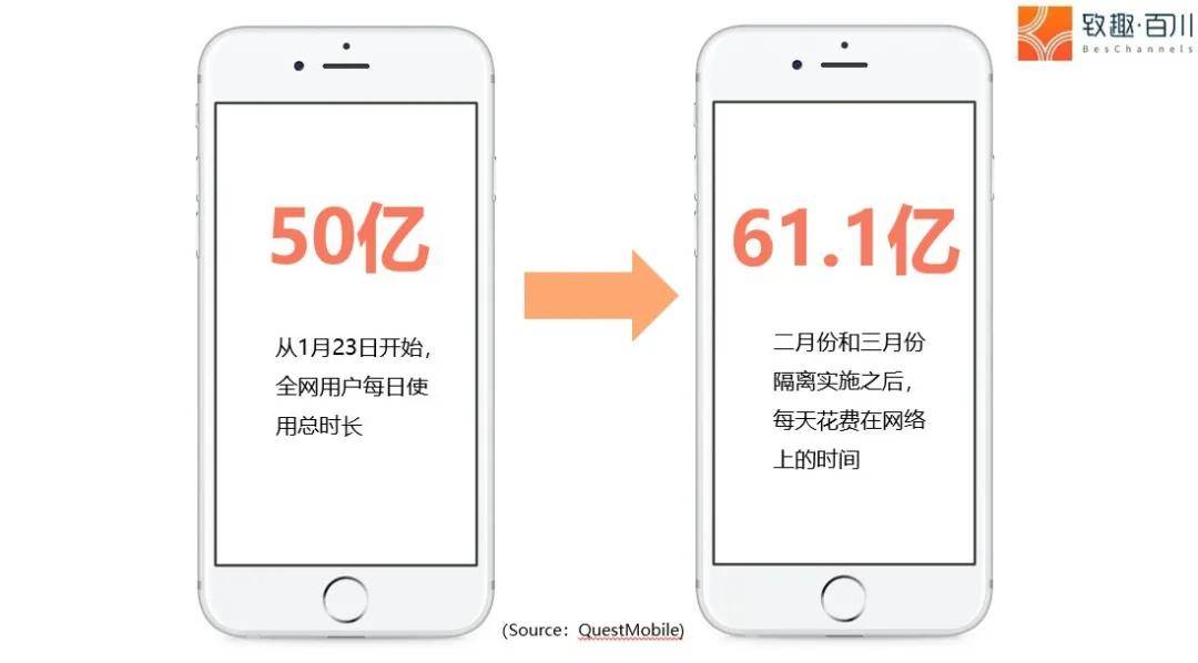 CTR数据显示,在疫情期间,79.9%消费者通过移动互联网获取信息。QuestMobile数据显示,从1月23日开始,全网用户每日使用总时长节节攀升,从原来的50亿小时,一路飙涨到61.1亿小时。