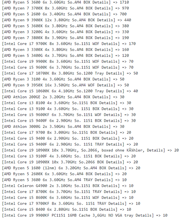 很明显无论是超高端的锐龙9 3900X还是入门级APU锐龙3 3200G,都有不错的排名,AMD全线产品都受到了德国DIYer的青睐。
