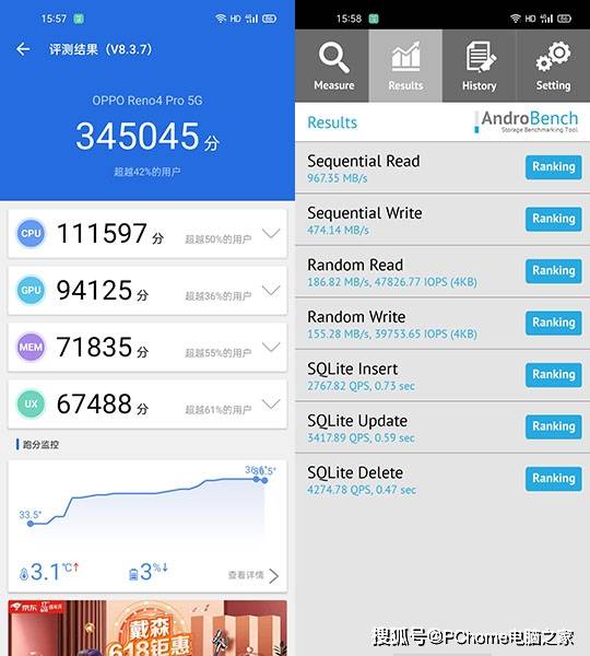 性能表现方面,OPPO Reno4 Pro在安兔兔评测的跑分成绩为34万分以上,表现出了高通骁龙765G的正常水准。同时,它拥有8GB+128GB与12GB+256GB两种存储配置,适合不同人群,足以应对用户的日常需求。