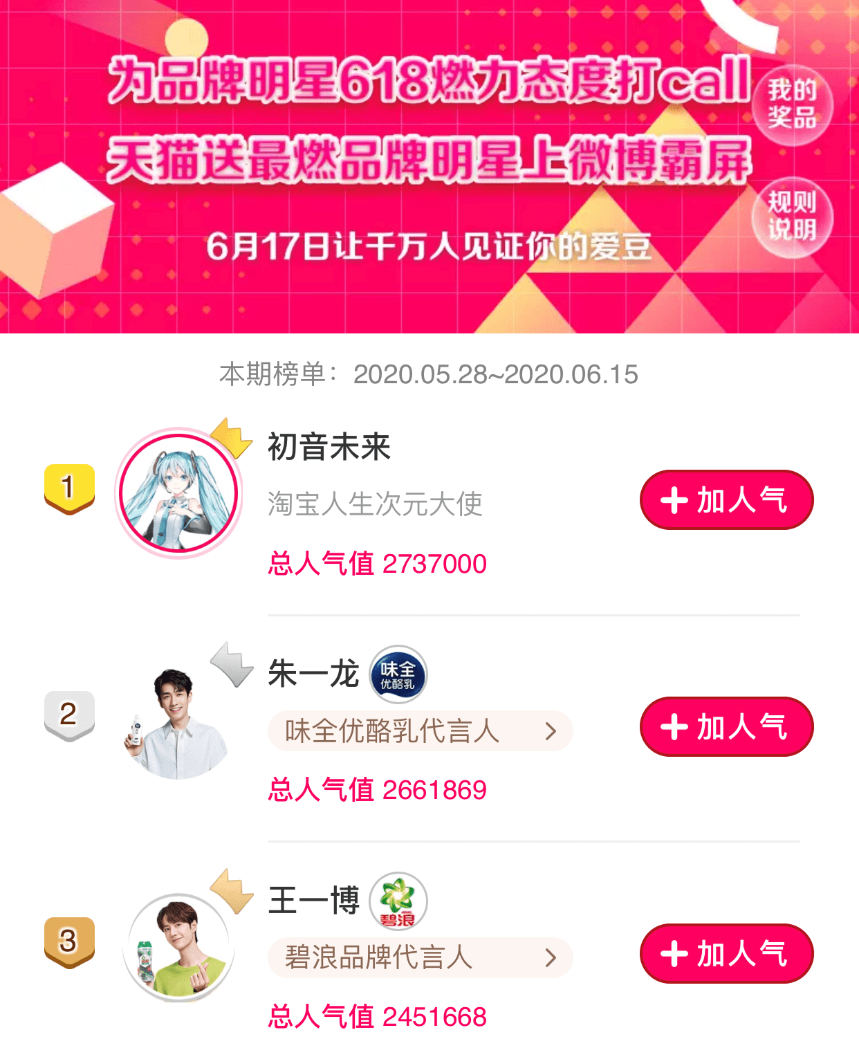 淘宝披露,截至11时30分,初音未来人气值已超过270万,超过王一博、朱一龙等流量明星,已登顶天猫6·18明星榜。