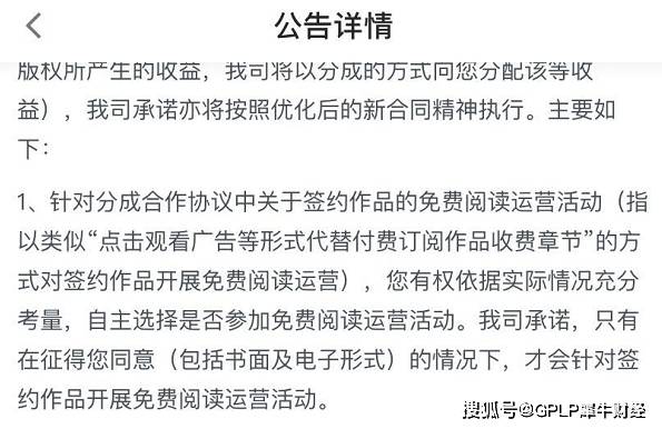 在阅文集团作家公告书中可以看到,阅文集团表示针对分成合作协议中关于签约作品的免费阅读运营活动,作者有权依据实际情况充分考量,自主选择是否参加免费阅读运营活动。阅文集团承诺,只有在征得作者同意(包括书面及电子形式)的情况下,才会针对签约作品开展免费阅读运营活动。