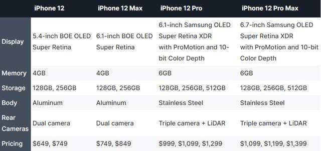 另外,苹果在运存上又做了升级,之前iPhone11系列标配4GB运存,这次在iPhone12上直接升级到了6GB,可以确保iPhone12在5G环境下保持流畅的多任务运行能力。两款标准版提供128、256GB的存储版本,而Pro版则多了512GB的存储选择,从此告别了64GB历史舞台。