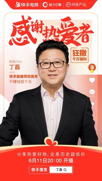 原标题:丁磊确认这一天快手首秀,直播带货网易严选和猪肉,送一百年会员