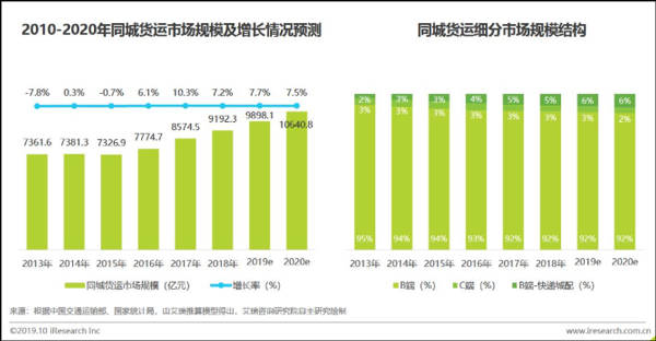 根据《2019年中国同城货运行业研究报告》显示,2013年以来,同城货运规模稳步扩大,预测在2020年,同城货运规模将突破万亿。