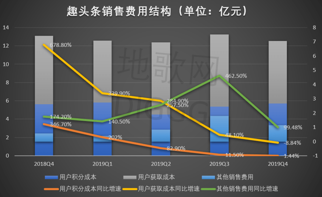 本季度,趣头条的用户积分成本为5.075亿元,同比下降12.6%,环比下降11.18%;每日活用户每日积分成本为0.12元,同比下降28.1%,环比下降9%;获客成本达5.02亿元,同比下降25.7%,环比下降26.27%;每新安装用户的平均获客成本约4.6元,同比下降26%,环比下降17%。