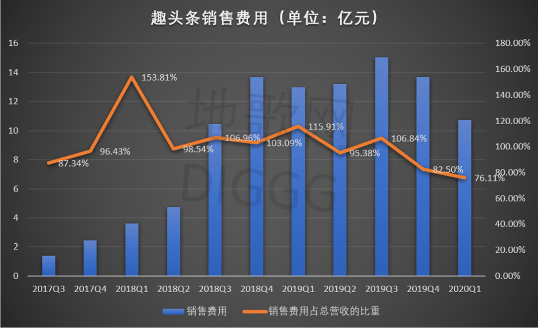 与此同时,更大变化来自销售费用。一季度,趣头条的销售及营销费用达到10.745亿元,同比减少17.1%,占总营收比重收窄至76.11%,系2017Q3以来的最低值;销售费用率达到76.1%,系趣头条成立以来的单季度最低值。