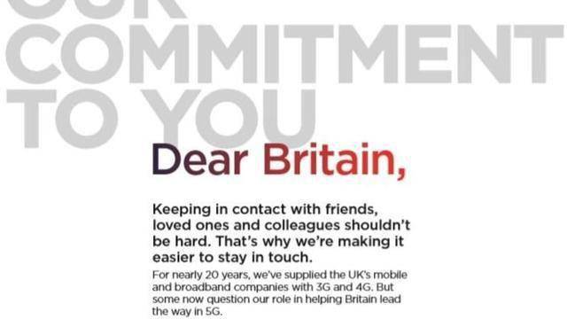 原标题:华为在多家英国报纸买下整版广告 回击5G安全担忧