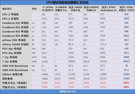 另外即便是25W的锐龙7 4700U,它的多核性能也与45W标压版的i7-10750H非常接近,二者仅有3%的差距。