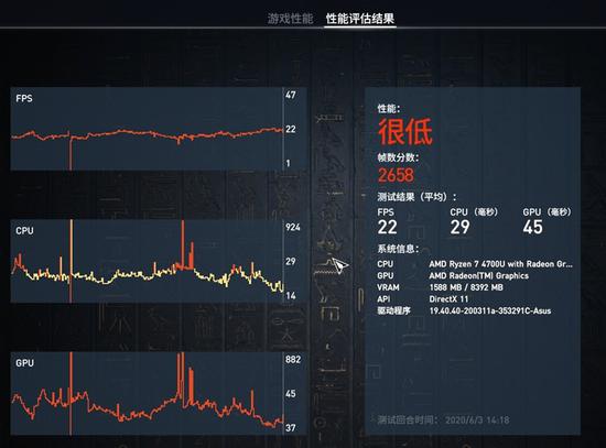 在《刺客信条:起源》中,灵锐14的成绩为22FPS,比RedmiBook 16锐龙版的20FPS要稍高一些。