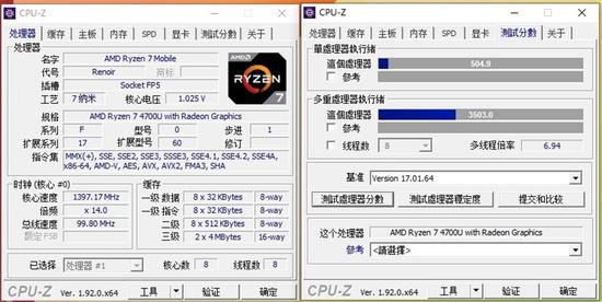 在CPU-Z 1.91版测试中,锐龙7 4700U的单线程分数为504,多线程分数为3503。
