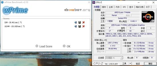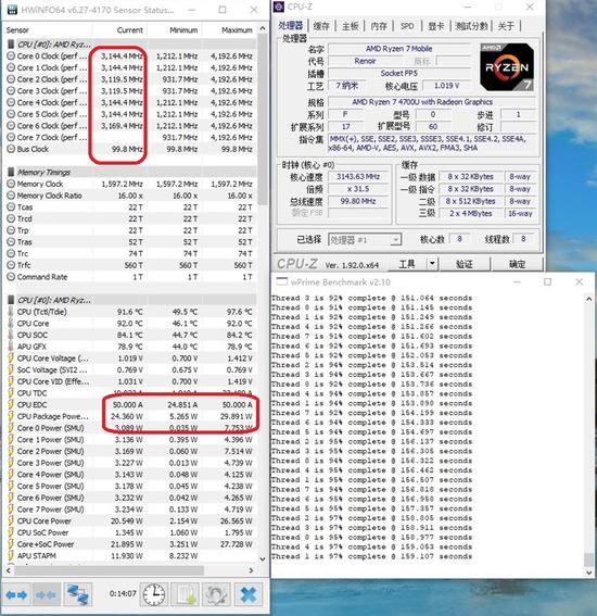 25W的锐龙7 4700U在稳定状态下能以多高的频率运行呢!我们使用wPrime 1024M进行测试,同时也测试了在处理器满载25W时笔记本的温度表现。