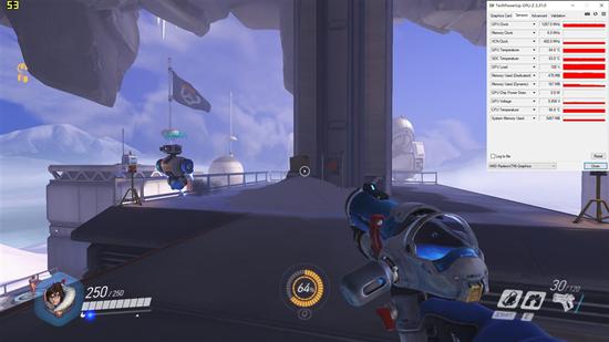 《守望先锋》有些不同,这款游戏既吃CPU,也吃GPU,因此会出现抢功耗的情况。从上图的GPU-Z截图中我们可以看到,Vega7核显的GPU占用率是100%,但是频率为1288MHz,与默认的1600MHz有些差距。