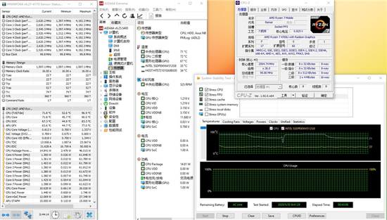 在使用AIDA64 FPU进行烤机测试时,我们发现锐龙7 4700U会在一段时间内维持25W的功耗,当温度达到92度之后就会开始降频降功耗,最终会稳定在15W,而此时的温度为71度,烤机频率达到了全核2.6GHz。
