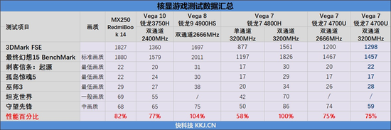 想要完全发挥Vega7的性能,还是需要适当解除锐龙7 4700U的TDP限制,同时也需要1.35V电压的低时序3200MHz双通道内存。也就只有对重量和厚度没有要求的游戏本可以做到。