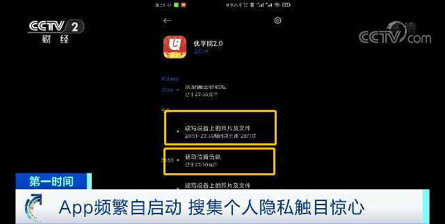 其中一款移动教学软件“优学院”十几分钟访问手机照片和文件近25000次;另一款办公软件“TIM”一小时内尝试自启动近7000次,并不停读取通讯录;还有很多常用的社交、办公、娱乐软件也都存在后台高频率读取着手机信息行为。