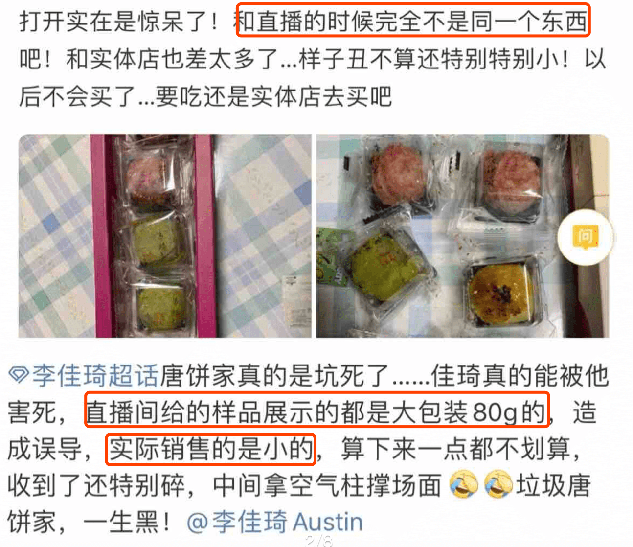 该用户随即找到唐饼家客服,客服回复称实际发货是和李佳琦同款,李佳琦的客服也回复说是视觉问题。但不少用户同时在李佳琦超话评论称,货不对板。