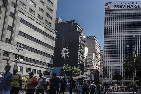5月20日,人们在巴西圣保罗市中心排队领取救济食物。新华社 资料图