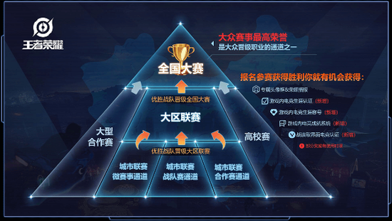 在城市联赛合作赛通道中取得胜利的战队,将晋升到大区联赛继续参与挑战,大区联赛的优胜队伍,将有机会进入全国大赛,为大众赛事的最高荣誉而战。2020年下半年开始,全国大赛将有固定名额供优胜战队晋级王者荣耀职业发展联赛(简称KGL)。最终在KGL中胜出的战队,将有机会晋级王者荣耀职业联赛(简称KPL),直抵王者荣耀电竞体系的巅峰。