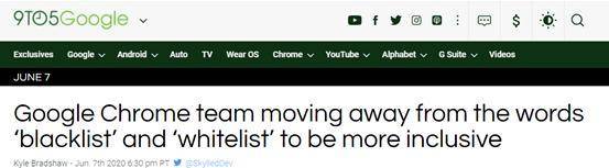 根据多家国外科技网站报道,美国谷歌公司旗下的Chrome浏览器开发团队,准备将其程序代码中所有的“黑名单”和“白名单”一词,用更加“种族中立”的词语替换掉,以支持美国黑人的反种族主义的运动,消除程序代码中潜藏的隐性种族主义。