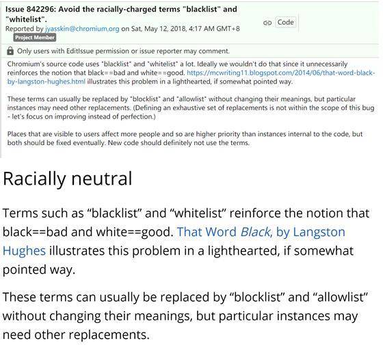 图为此前谷歌Chrome浏览器的程序人员提议避免使用“黑名单”等有种族主义色彩的用语