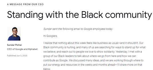 ▲图为谷歌公司的印度裔CEO桑达尔·皮查伊表示支持美国黑人群体的抗争