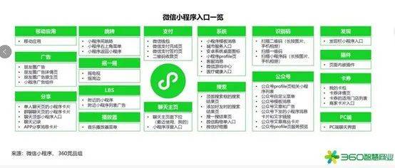 从互联网工具的演变不难看出,无论是web还是APP都在强调用户使用的便捷性,小程序的出现更是将这一点延续,无需安装,云端部署,模块化开发语言,用户不必为了使用某一款APP的功能而进行下载注册,提升用户使用体验,实现新型“用完即走”理念,全面打通线上线下互动应用,让优质的服务入驻于小程序,吸引用户,之后再陆续为商家开放变现渠道。 微信庞大的用户规模,为小程序注入了极大的活力,多种小程序入口可以让商家利用微信的流量为业务带来更多机会。从这张表里可以看到,微信入口包括移动应用、广告、分享、跳转、LBS、支付、搜索、公众号、卡券等各种形式。
