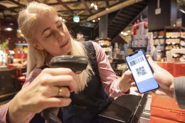 在奥地利维也纳,一名咖啡店工作人员扫描一位顾客的支付二维码。新华社游戏网