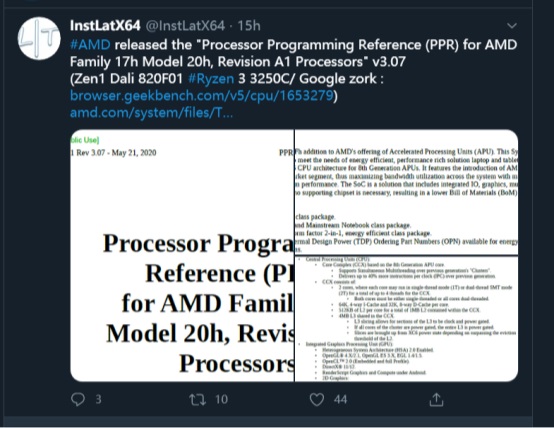 6月9日消息 推特用户@InstLatX64 日前曝光了一份 AMD 处理器编程参考(PPR)文档。该文档揭示了新的 AMD Ryzen 3700C 和 3250C 处理器,并透露了 Google zork 这一设备。