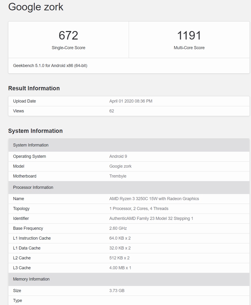 经查询,Google zork 此前在 Geekbench 5.1.0 的跑分成绩显示:AMD Ryzen 3 3250C TDP 设定为 15W,2 核 4 线程设计,基准频率 2.60 GHz,单核成绩 672,多核成绩 1191。。AMD Ryzen 7 3700C 同样基于 15W 的 TDP,4 核 8 线程设计,基准频率 2.3GHz,单核成绩 826,多核成绩 1739。