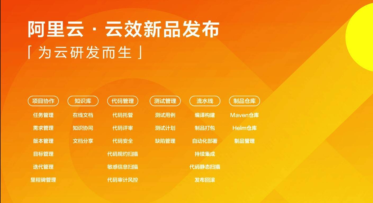 让每个企业都可以成为精英研发团队是我们的梦想,为此我们不断迭代产品沿着这个路线前进。在过去一段时间我们将阿里巴巴最先进的云原生和智能化能力结合当前云上客户痛点打造了新一代云效产品矩阵,包含“项目协作”“知识库”“ 代码管理”“测试管理”“流水线” “制品仓库”六大核心产品。新云效覆盖了从协作、开发、测试、交付的全链路,并且和阿里云无缝结合。相对于老版云效,我们重点打造了新一代企业级代码管理和流水线产品,在过去半年经过了数千家企业的内测验证,安全可靠,今天正式邀请广大开发者访问云效官网进行使用,希望新云效可以助力开发者打造一支数字化的精英软件研发团队。