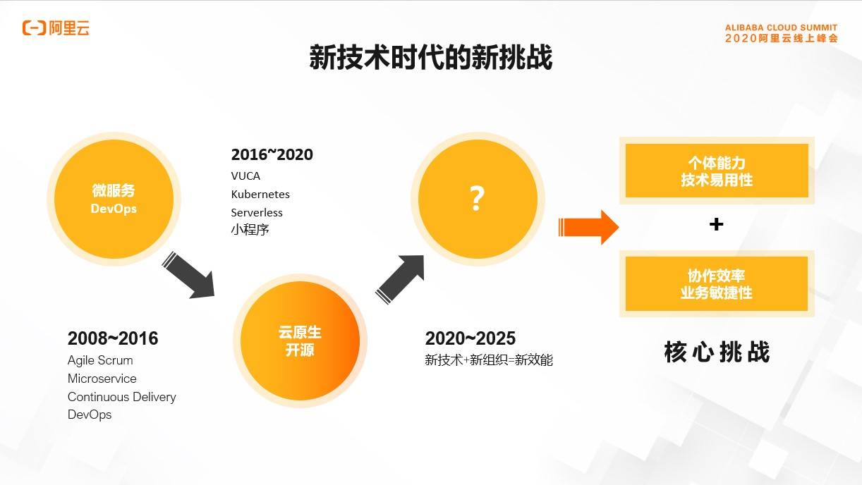 第三阶段将是未来的五年,一方面云上的技术创新会继续深入,技术复杂性会不断下沉到云,赋能开发者个体能力,不断降低技术应用成本。另一方面我们需要关注组织效能。最近在线协作办公一定让大家印象深刻,很多公司一夜之间似乎就适应了协作线上化,并且沟通效率似乎还有所增加,这就是一个新组织的典型案例。