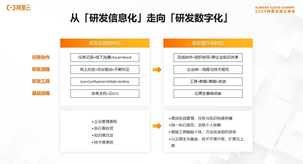 日常工作中我们使用各种工具去记录在工作中产生的数据,而这些工具又是信息孤岛,打通串联仍然靠“人肉”,这就是信息化。当“协作”和“研发”两个关键场景的流程都未完全打通时,管理就成为了难题,甚至只知道沟通难、交付慢,但找不到核心原因,更别提如何改进了。而数字化时代,我们会采用一系列先进的平台,将协作和研发的过程完全线上化,并利用平台的管理流程和理念去优化企业流程和管理效率。