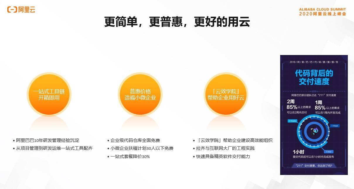2018年阿里巴巴发布的研发效能报告提出“211”的口号,也就是85%需求2周内交付,代码1周内开发完成,1小时内完成代码上线。我们希望能够用云效帮助广大开发者也能实现这个目标。