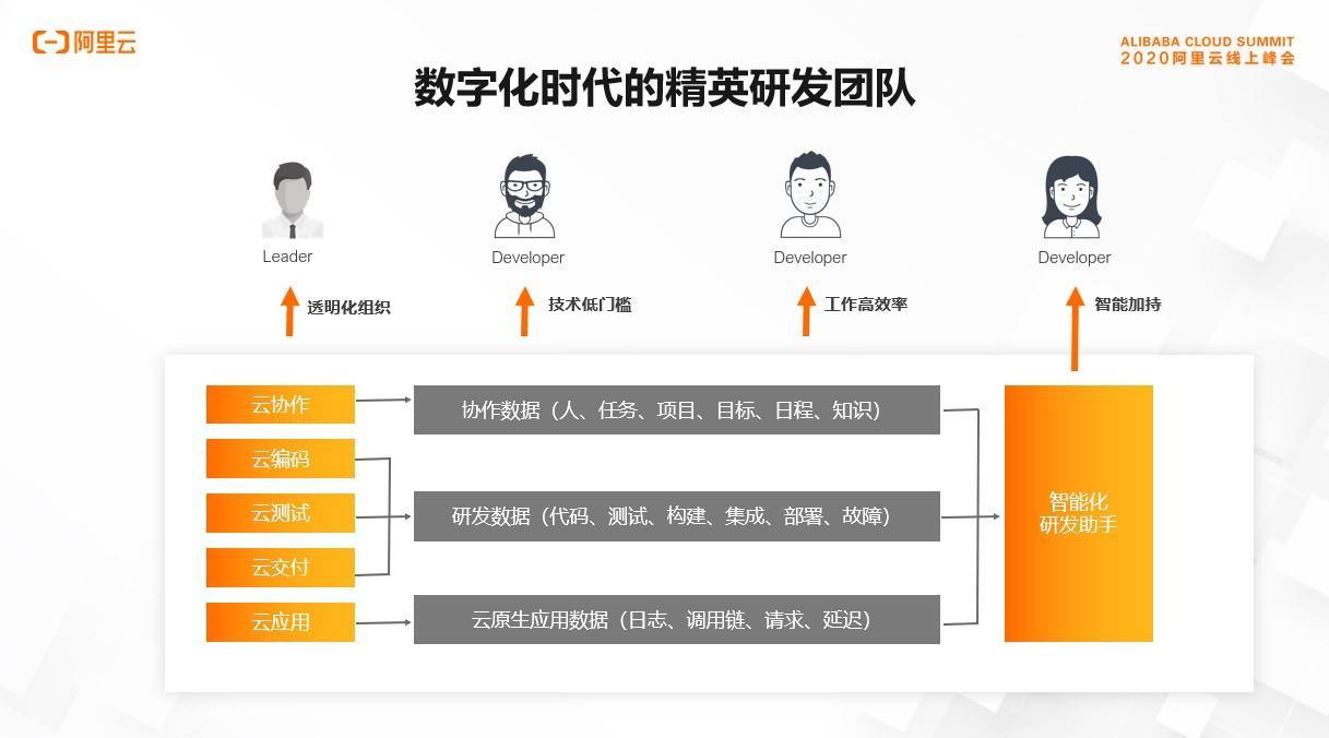首先看上图左侧,从协作、编码、测试、交付、应用运维,可以全面使用云化工具一站式完成。先进的工具加上先进的理念可以帮助企业构建透明高效的组织。当我们不断生产和积累知识后,研发数字化的魅力开始展现。