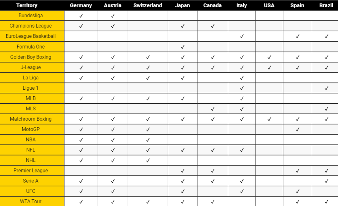 不同于竞争对手ESPN+和B/R Live , 这两家分别在ESPN、迪士尼或者华纳、AT&T等传统巨头媒体的撑腰下拥有大量的赛事版权,DAZN要靠大量采买的赛事版权,来弥补自己「输在起跑线」的劣势。