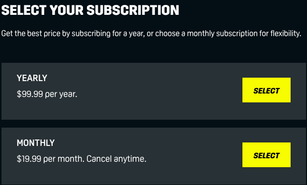 在订阅价格上,最初推出时,DAZN采用第一个月免费,第二个月开始每月费用为9.99美元,每年为99美元的订阅套餐。但从2018年下半年,DAZN在美国区取消了这项服务,不再有第一月免费的选项,价格也提升到了19.99美元每月和100美元每年。