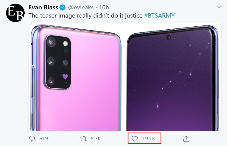 值得一提的是,evleaks 的这条推特刚发布没几个小时就已经成为他迄今点赞量最高的推文,可见 BTS 粉丝力量之大。