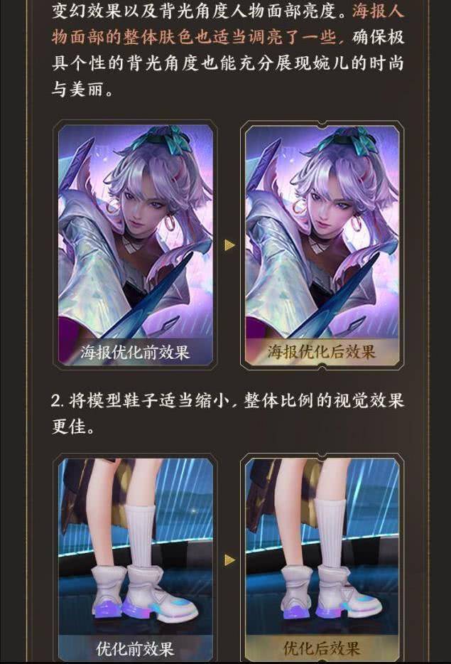 在此次优化当中有多个部分的改动,首先就是海报脸部整体肤色调亮了一些,相比原来的婉儿看起来更白了,发色也更加时尚,建模中的鞋子也进行了缩小,比例看起来更加和谐。同时特效也进行了微调,似乎是一技能的炫彩K字变得更加花哨和显眼,不过具体的感受还要等到大家自己进游戏体验过才知道。