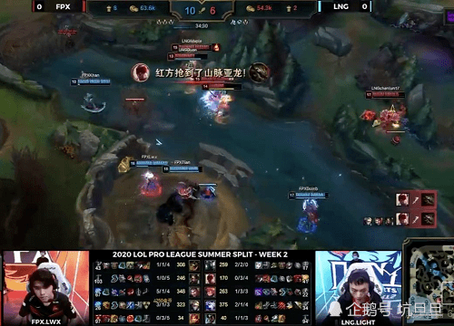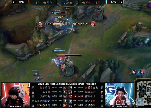 10分钟时,LNG中野一起来到下路,利用峡谷先锋把FPX下一塔撞成丝血。12分钟,Khan利用自己上路的推线优势,游走到了中路。他直接从F6处杀出,配合Doinb一套技能秒掉了Maple。随后Doinb在中路推掉一塔,可是推掉一塔后他们没去小龙坑座做视野,结果第二条小龙反倒又被LNG这边抢先开打并拿下。