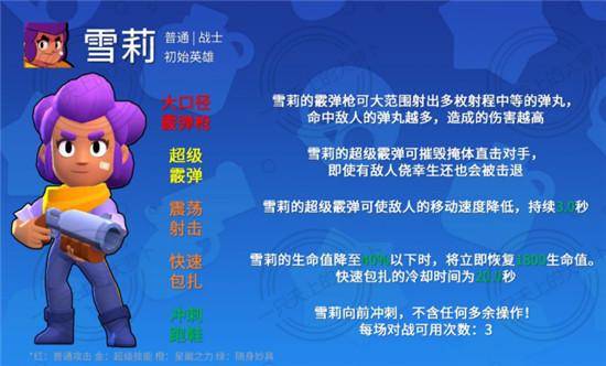 根据游戏机制设定,散弹枪的会扇形射出子弹,命中敌人越多子弹伤害越高,因此如果能够近身和敌人刚枪,就可以达到最大化伤害。所以在使用雪莉时需要有优秀的走位和战术,也可以利用草丛来埋伏对手打先手,非常强悍!对于新手来说是一个必玩英雄。