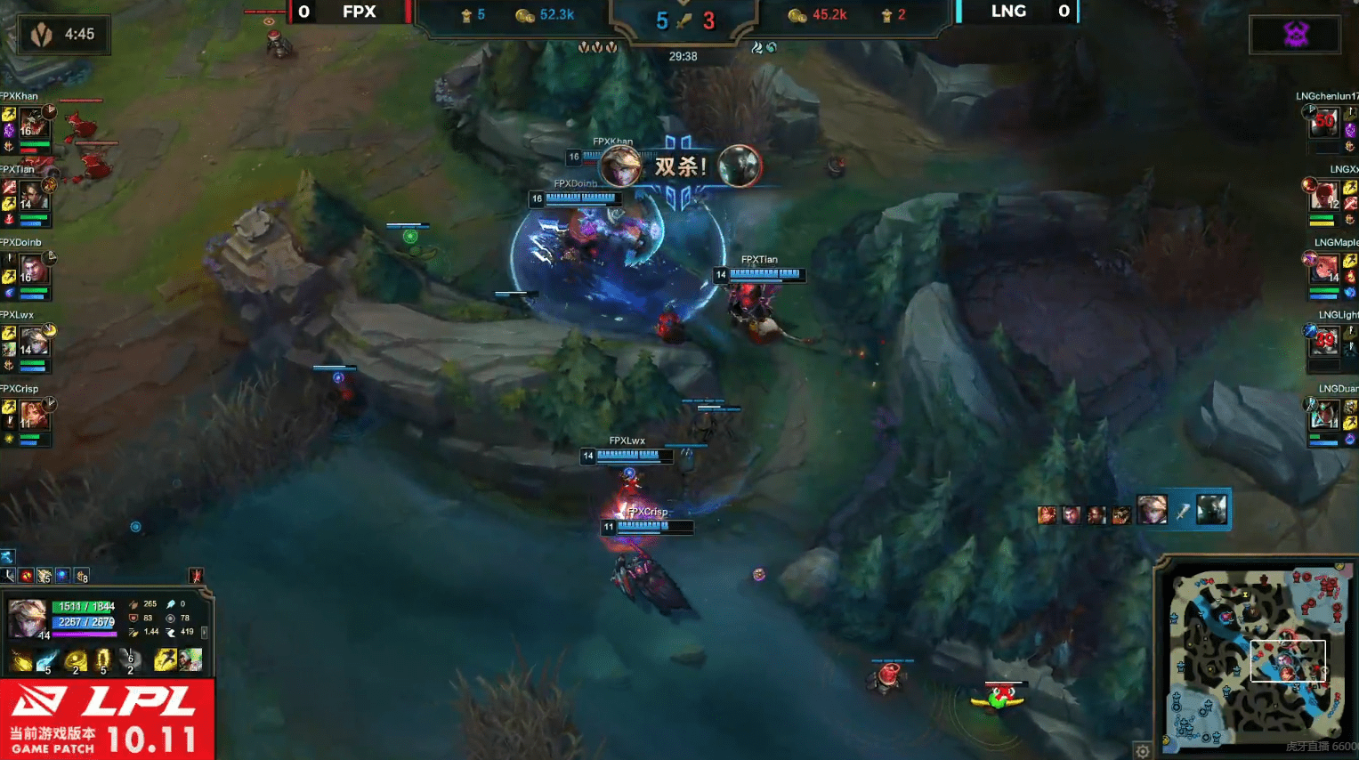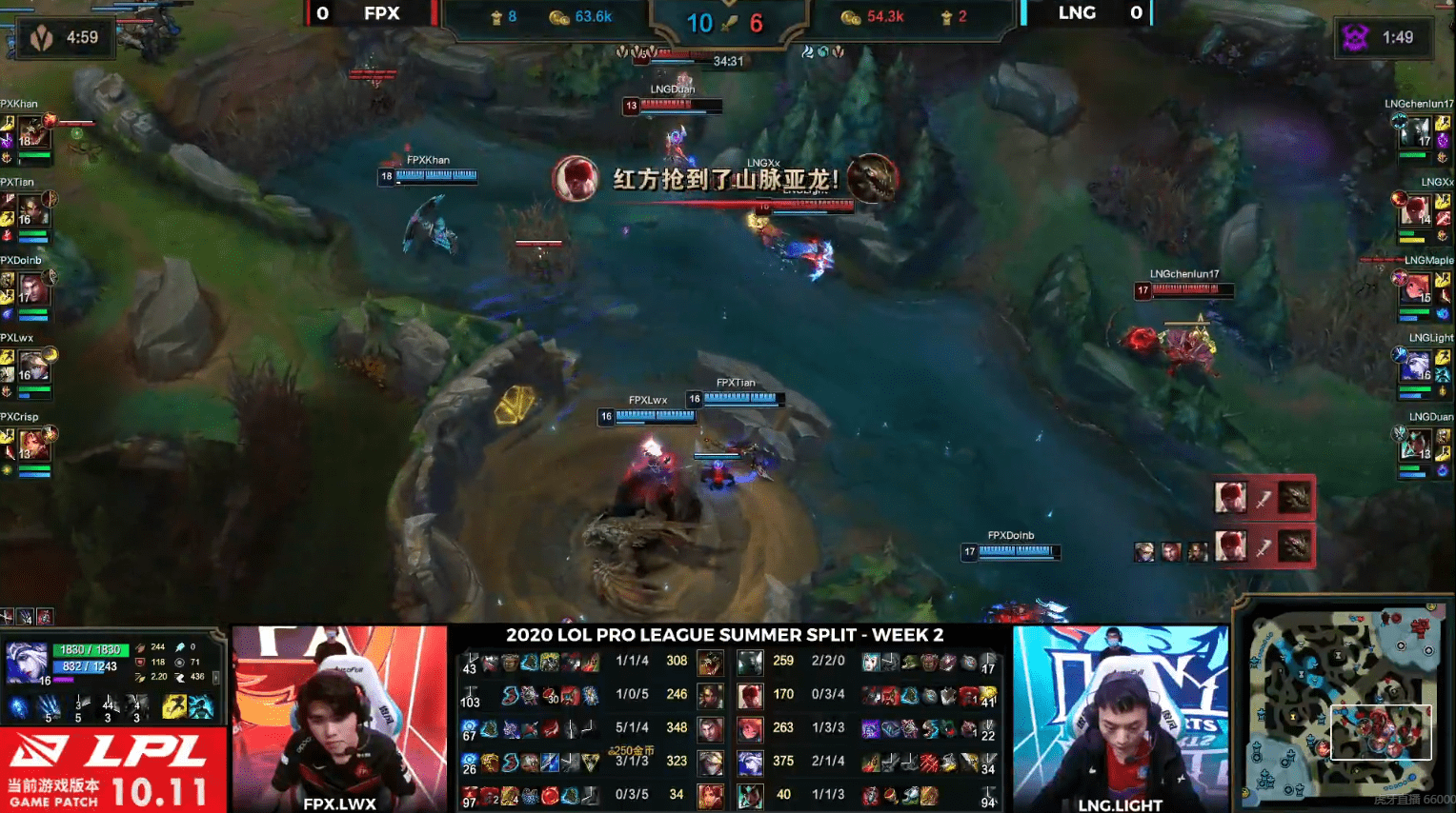 在中期双方再度进入运营局面,FPX凭借着3poke阵容开始抱团推进,成功破掉了LNG中下两路外塔,29分钟时先行占据了小龙坑,直接rush掉了小龙,而由于不决没有太多开团技能的LNG也被FPX留下,LwxEZ完成双杀,FPX顺势控下大龙!