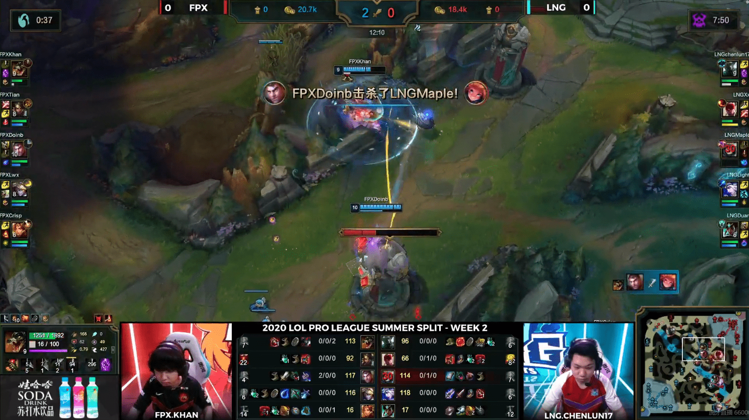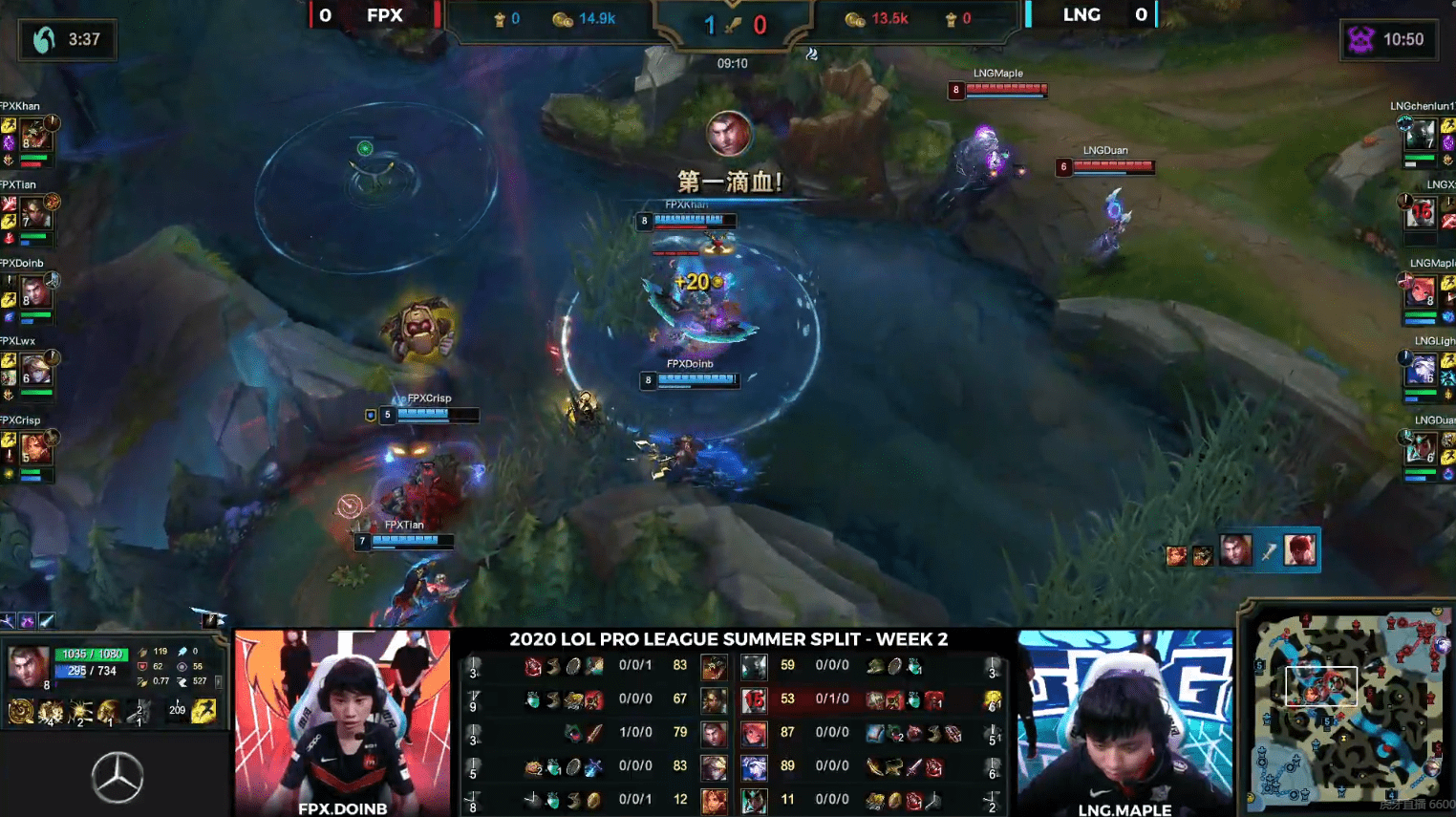 在开局双方也是偏运营节奏,第一条小龙由LNG控下,小天豹女在交换峡谷先锋时惩戒失利,被maple佐伊火箭腰带抢到了先锋,但是后续想要入侵FPX蓝buff,被赶来的刘青松女坦留住,doinb杰斯跟上伤害拿下了xx盲僧一血!