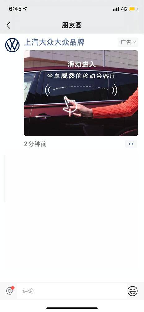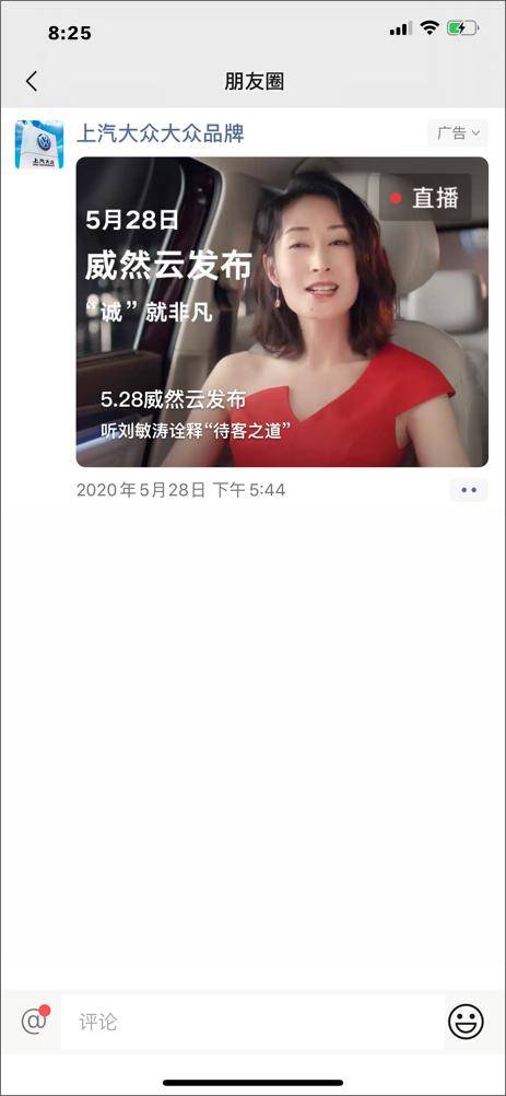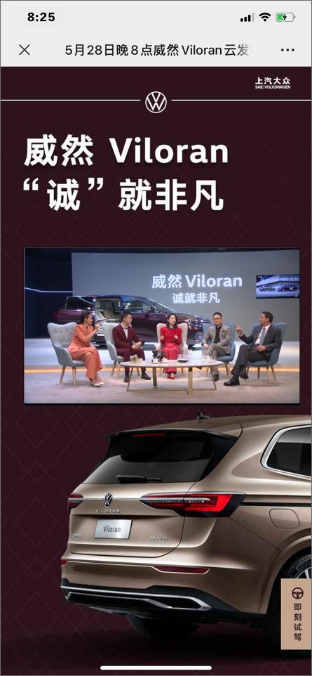 近日上市的上汽大众高端MPV车型Viloran威然,就于上市期间在朋友圈做了一次“云发布”直播和互动式广告的组合投放,成功吸引了广泛大众的关注。