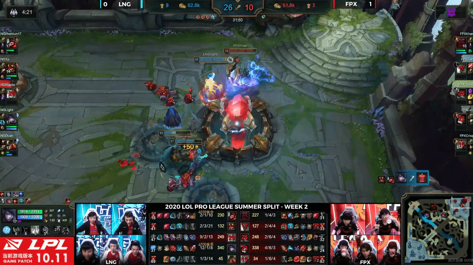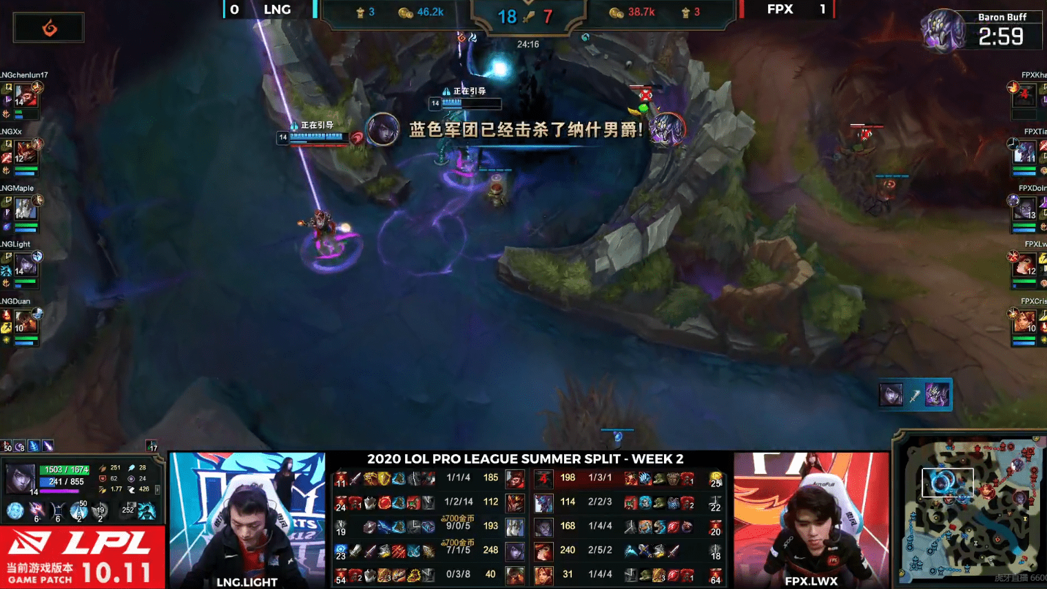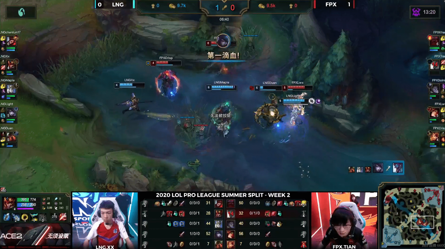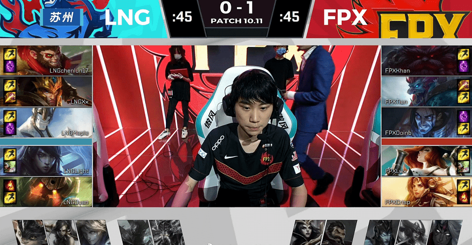 面对LNG携带大龙buff的推进,FPX选择主动开团,汉子哥奥恩羊来撞起了关键C位Light厄斐琉斯,并且跟上头槌二段控制,但是maple加里奥以及xx皇子双大招控住了想要跟伤害的FPX成员,厄斐琉斯半血从空中下来后继续无压力输出双杀收割,不过想一波时太过着急被FPX成功防下。
