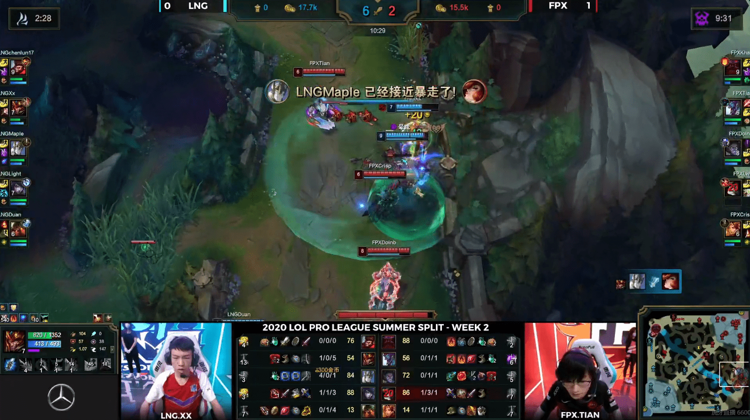 LNG在中野取得了优势后,xx皇子持续的针对FPX下路,连续的四包二配合maple加里奥大招,开启了为所欲为体系,加里奥再度打出收割,前期6-0开局暴走!
