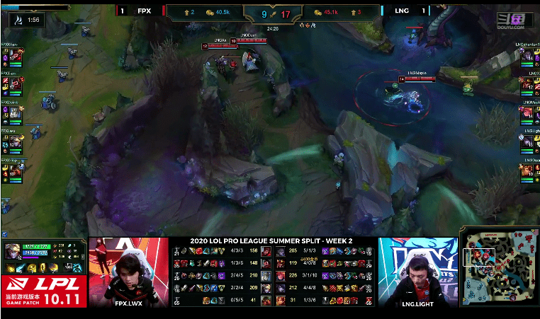 [17:25] LNG在中路与FPX1换1后,加里奥嘲讽给到LNG,猴子开启大招,EZ和男枪跟上伤害,LNG溃不成军,交代两人。