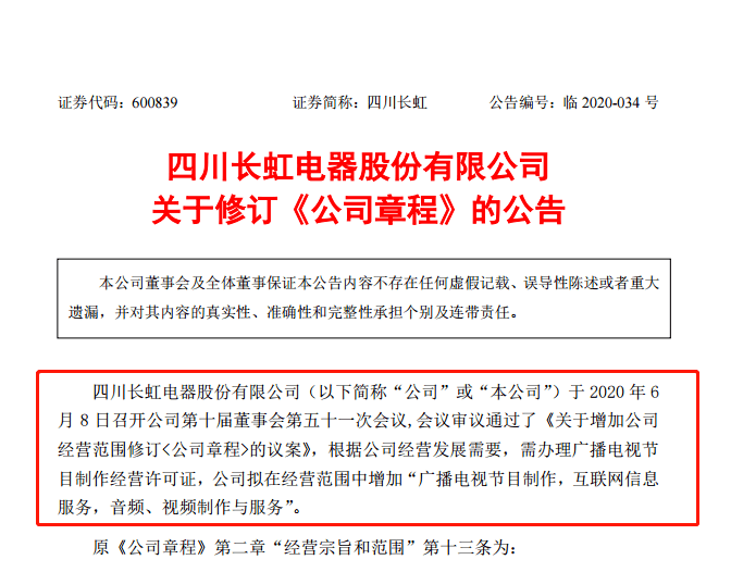 6月9日晚间,四川长虹公告披露,其董事会审议通过了《关于增加公司经营范围修订<公司章程>的议案》,因上市公司经营发展需要,需办理广播电视节目制作经营许可证,经营范围拟增加“广播电视节目制作,互联网信息服务,音频、视频制作与服务”。