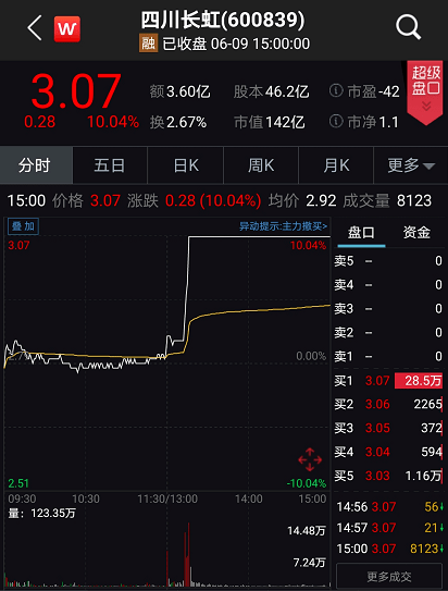 在宣布将与知名MCN机构联合打造直播平台后,今天午后,四川长虹股价直线涨停,收于3.07元,市值达到142亿元。截至收盘,仍有28.5万手买盘封涨停板。