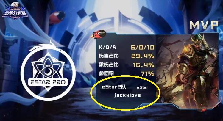 事情是这样的,斗鱼搞了一个赏金公会赛,邀请了很多职业选手和主播参加一起打王者荣耀的比赛,其中就有Estar二队的。而二队的比赛结束之后,可以清晰地看到MVP给到了一个叫做jackylove的选手。