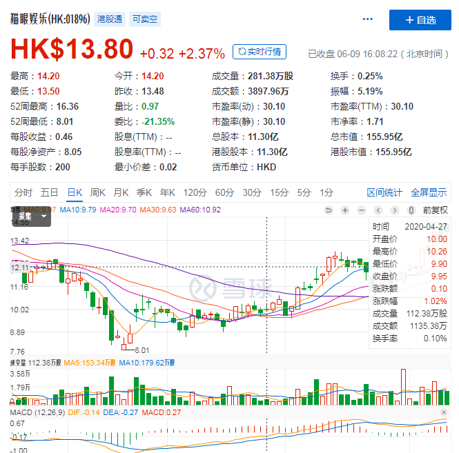 资本市场对于这一升维合作也抱有积极的期待。公告发布的第二天,也就是6月9日港股猫眼娱乐收盘价为13.8港元/股,收涨2.37%,资本市场期待猫眼X腾讯的更大想象空间。